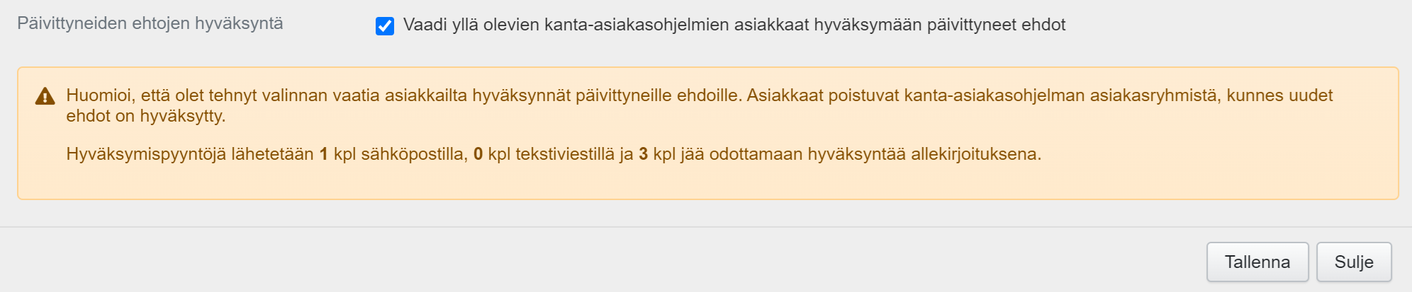 Jos yrityksesi haluaa päivittää kanta-asiakasehtoja, ehdot voidaan lähettää päivityksen jälkeen massana hyväksyttäväksi kaikille ohjelmaan kuuluville asiakkaille. Päivität ehdot ja lähetät ne hyväksyttäväksi seuraavasti: