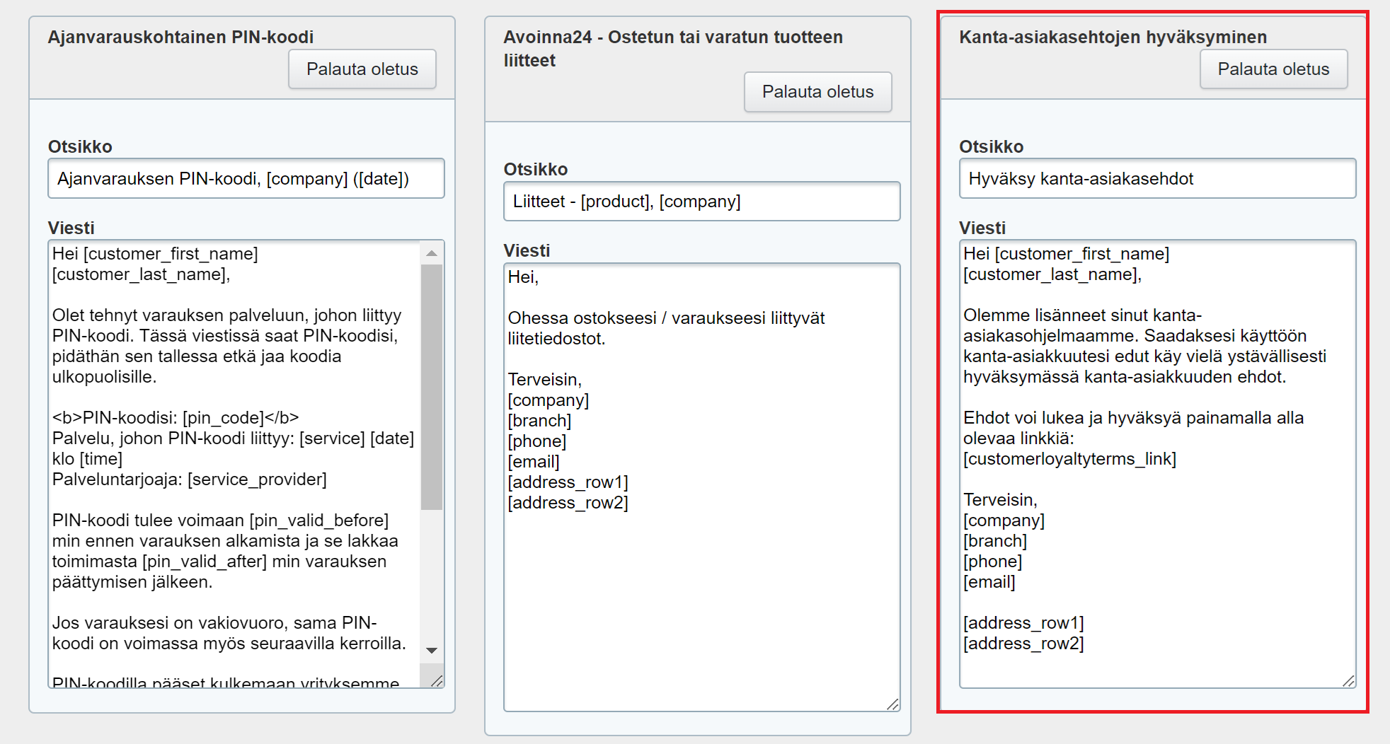 Asiakas voidaan kutsua liittymään kanta-asiakasohjelmaan ja samalla hyväksyttää tällä ohjelman ehdot. Sähköpostilla tai tekstiviestillä lähetettävää viestipohjaa pääset muokkaamaan seuraavasti: