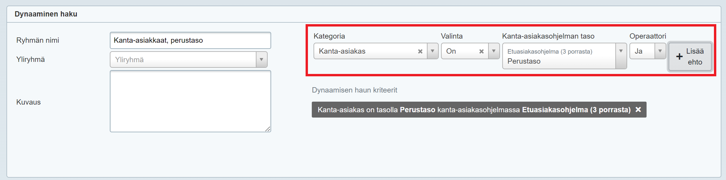 Tietoa dynaamisista asiakasryhmistä löydät myös ohjeesta Dynaamisen asiakasryhmän luonti.