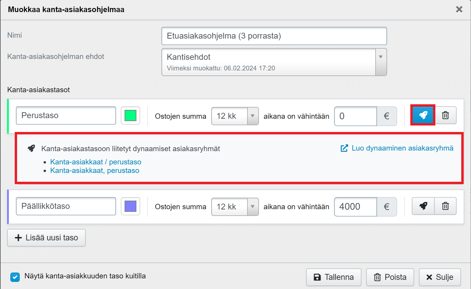 Huom! Kun tiettyyn kanta-asiakastasoon on liitetty dynaamisia asiakasryhmiä, näet Yritysasetusten Asiakasasetukset-välilehdellä kanta-asiakasohjelmia hallinnoidessa rakettikuvakkeen. Sitä klikkaamalla näet listauksen dynaamisista asiakasryhmistä, jotka on liitetty kyseiseen kanta-asiakastasoon ja pääset myös tarvittaessa tätä kautta luomaan uusia dynaamisia asiakasryhmiä: