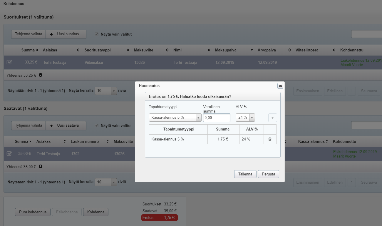 - Kun asiakas maksaa laskun kassa-alennuksen mukaisesti, reskontraan tullut viitemaksu esikohdentuu laskulle, koska suorituksen summa ei täsmää laskun loppusumman kanssa.