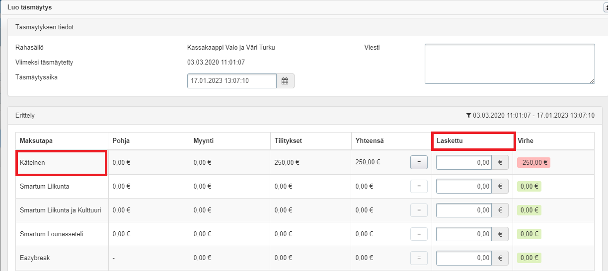- Jos esimerkiksi Myynti ja tilitykset -sarakkeen summa on -150 euroa, on kassakaapista edellisen täsmäytyksen jälkeen tilitetty pois 150 euroa enemmän kuin mitä sinne on samalla ajanjaksolla tilitetty kassalippaasta.