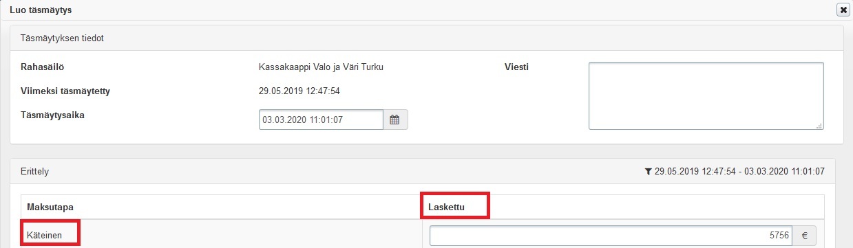 Suosittelemme täsmäyttämään ja tilittämään kassakaapin aina nykyhetkeen.