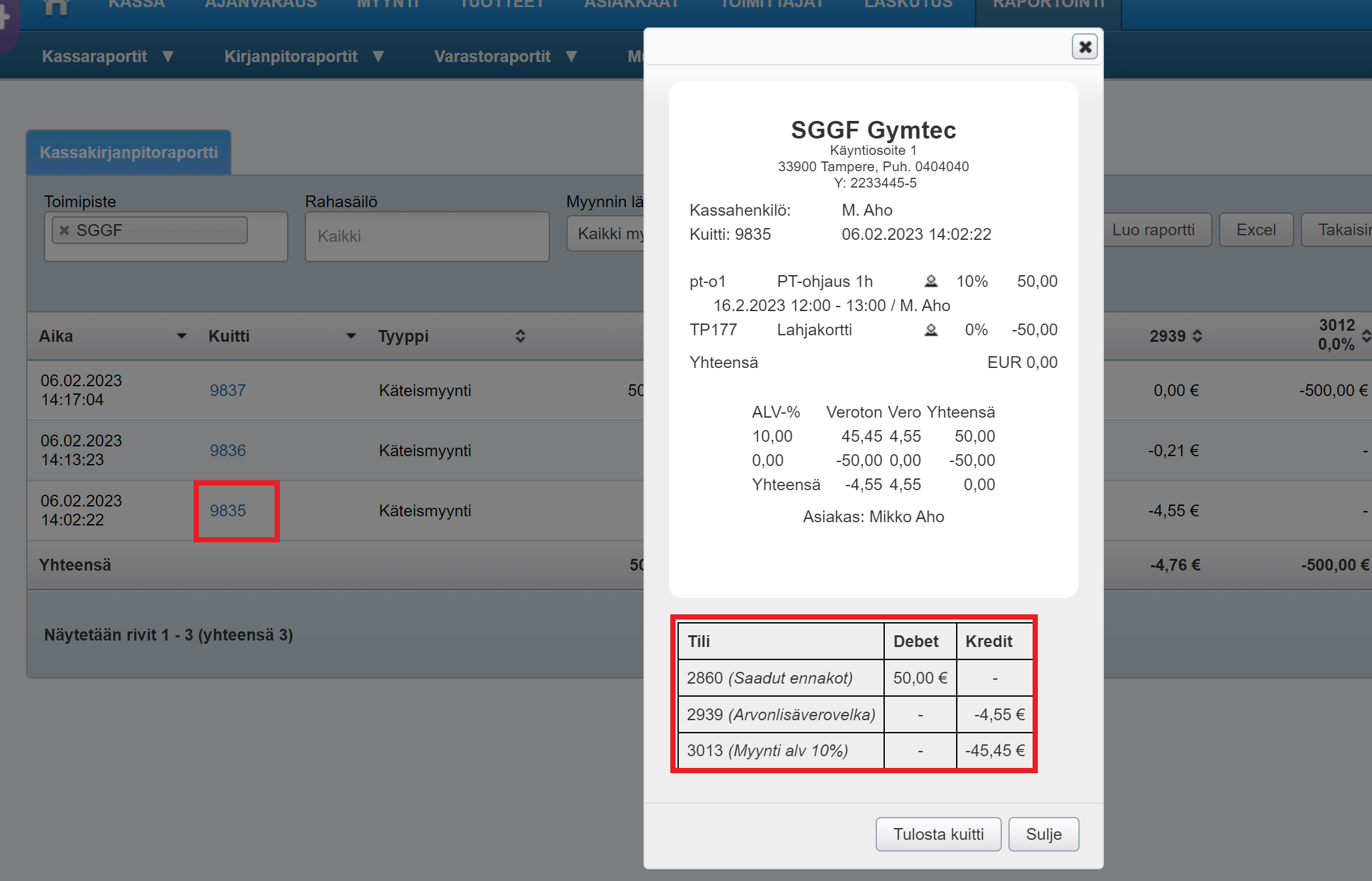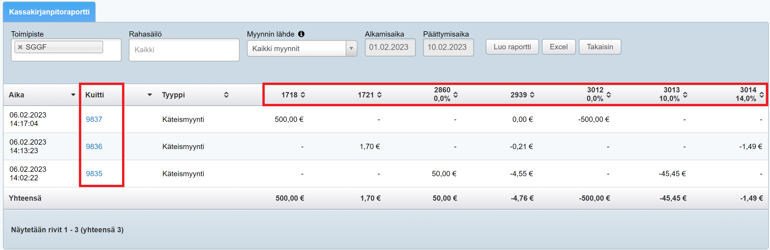 Kassakirjanpitoraporttia käytetään raportoinnin epäselvyyksien selvitykseen ja virheiden etsintään. Raportilla voi tarkastella kassan tapahtumia valitulla ajanjaksolla, ja sen avulla pääsee tutkimaan tapahtumia päivätasolla ja jopa yksittäisten tositteiden tasolle.