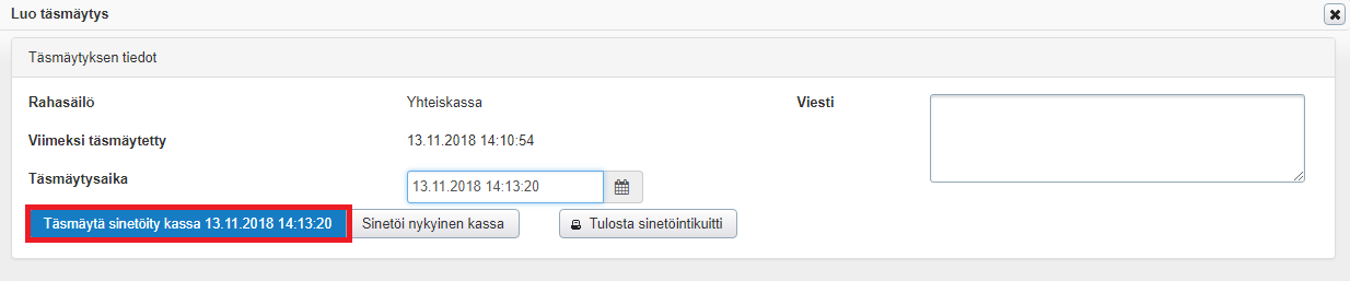 3. Valitse täsmäytysajaksi haluttu ajankohta ja klikkaa ruudun alareunasta Sinetöi kassa