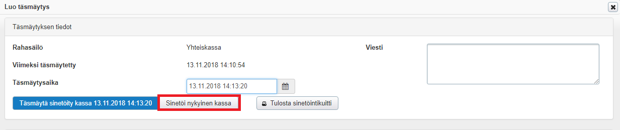 Valitsemall Sinetöi nykyinen kassa käytössä oleva kassalipas ja asettaa tämän käsittelyjonoon muiden sinetöityjen kassalippaiden jälkeen. Tällä tavalla pystyy aloittamaan uuden kassan käsittelemättä jo aikaisemmin sinetöityjä kassalippaita.