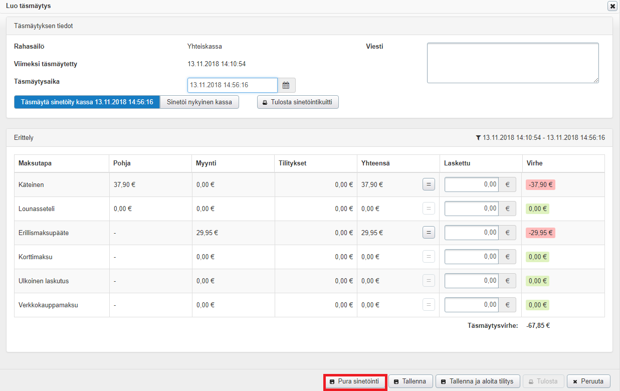 1. Sinetöidyn kassan täsmäytys