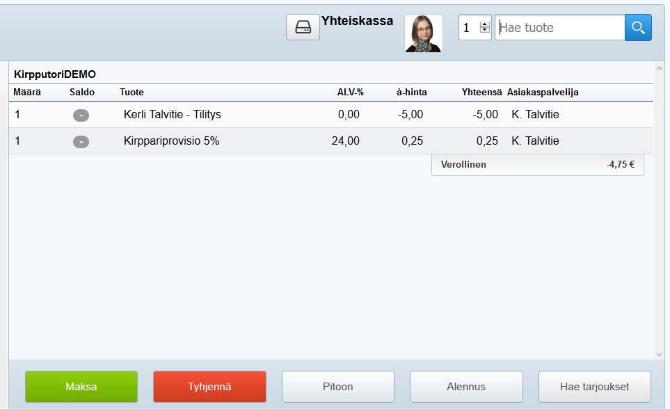 - Hae kassalla kyseistä asiakasta varten luomasi hyvitystyyppinen tuote (esimerkissämme Anssi Asiakas, tilitys).