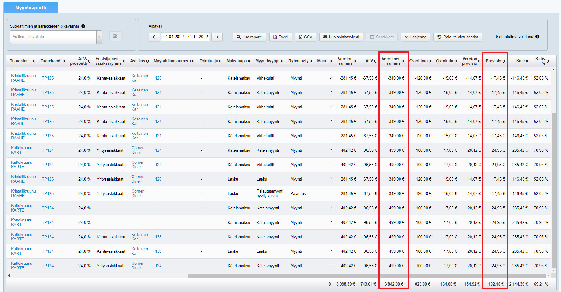 - Luo raportti. Löydät asiakkaan yhteenlasketun myynnin ja provision (sekä verottomana että verollisena) raportilta: