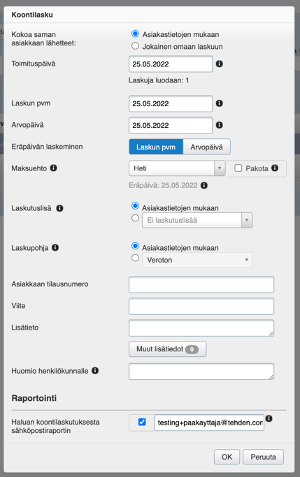 - Klikkaa OK. Koontilaskut lähetetään kunkin asiakkaan tietoihin merkityn oletuslaskutustavan mukaisesti. Valmiit laskut löytyvät Laskutetut-osiosta.