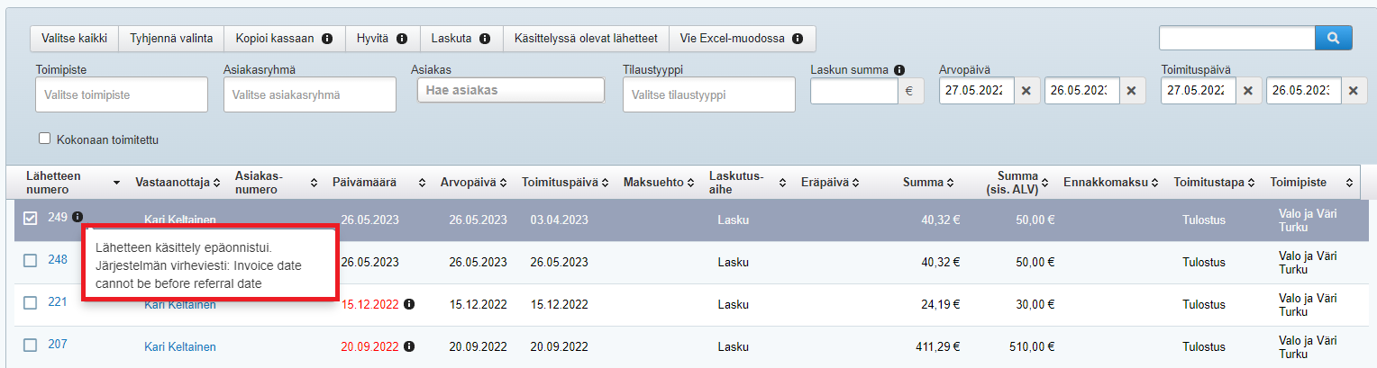 - Laskun päivämäärä on oletuksena kuluva päivä. Huom! Laskun päivämäärä voi olla aikaisintaan uusimman laskutettavan lähetteen toimituspäivä. Laskua ei siis voi päivätä lähetteen toimituspäivää kauemmas menneisyyteen. Jos näin tehdään, Tehden tiputtaa luotavalta laskulta pois ne lähetteet, joissa toimituspäivä olisi laskun päivämäärää myöhemmin, ja saat myös sähköpostiisi tästä ilmoituksen. Muiden lähetteiden osalta lasku luodaan normaalisti, ja laskuttamatta jääneet lähetteet palautuvat Laskuttamattomat-listalle. Syy lähetteen käsittelyn epäonnistumisesta löytyy, kun viet kursorin infopainikkeen päälle: