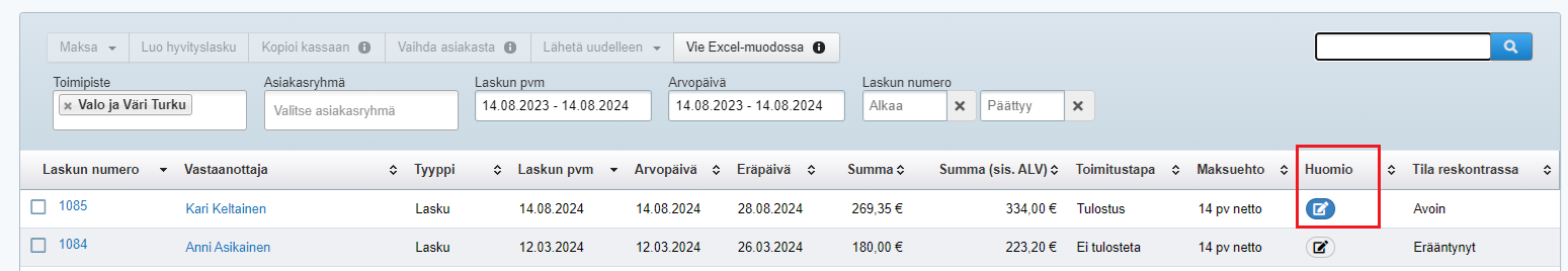 - Huomio henkilökunnalle ei tulostu laskulle, vaan on tarkoitettu henkilökunnalle, ja näkyy Laskutetut-listauksessa, kun hiiren vie korostetun Huomio-kuvakkeen päälle: