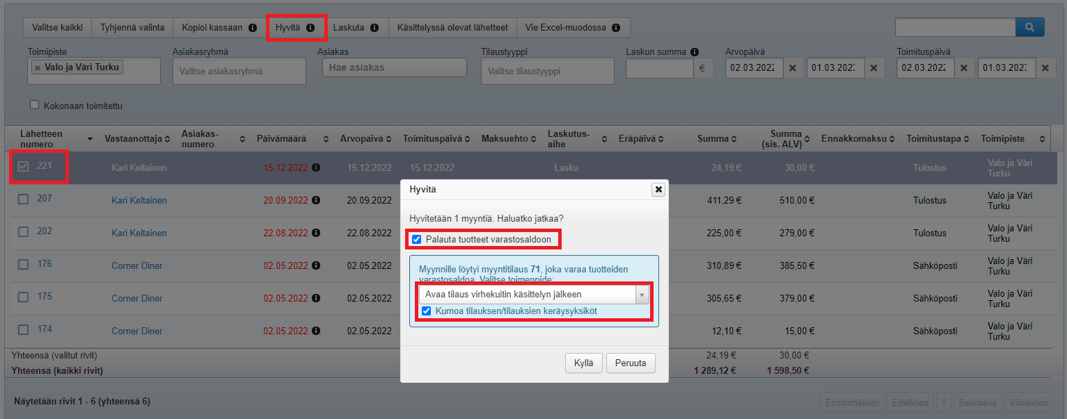 - Voit tarkistaa, että summat näyttävät oikeilta ja avata tarvittaessa yksittäisen lähetteen klikkaamalla sen numeroa. Virheellisen myynnin saa poistettua valitsemalla kyseisen rivin ja klikkaamalla sitten Hyvitä-painiketta. Tämän jälkeen myynnin voi tehdä kassalla uudestaan oikeilla tiedoilla.