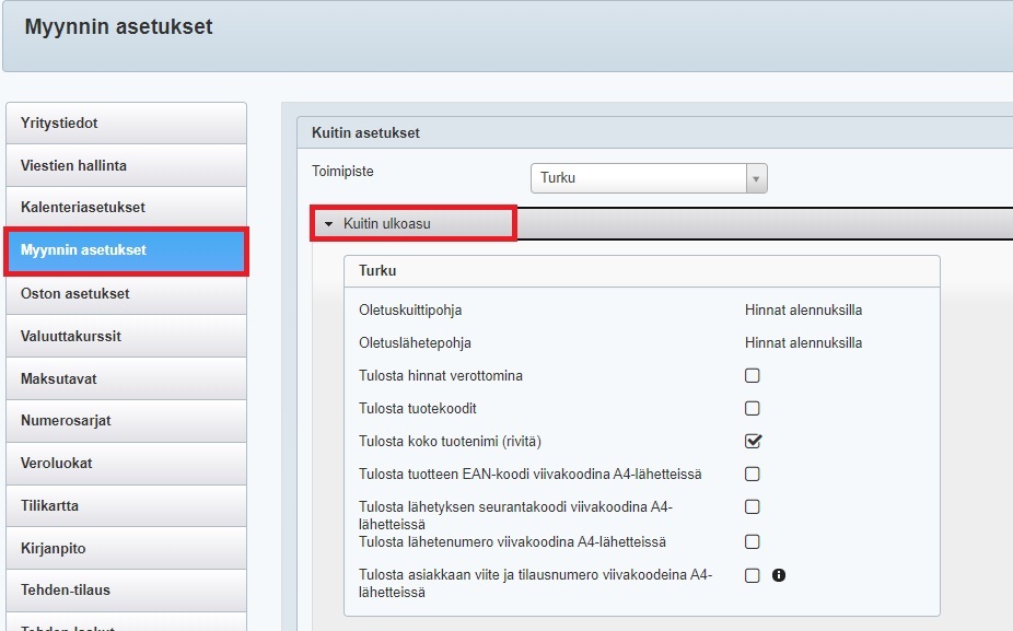 - Toimipisteen asetukset (näytetäänkö kuitilla toimipisteen nimi ja yrityksen virallinen nimi vai markkinointinimi): lue lisää ohjeista Uuden toimipisteen luonti ja Yritysasetukset ja toimipisteet.