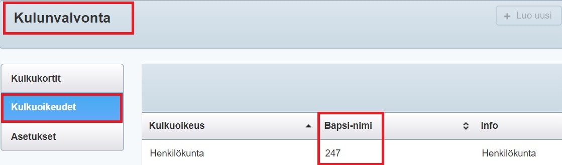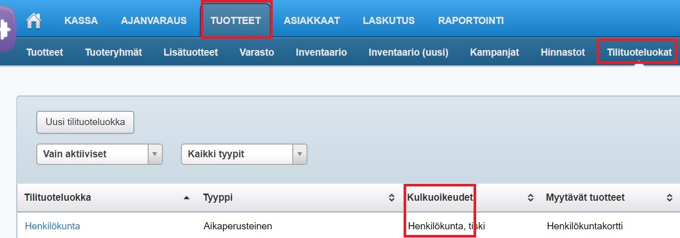 - Bapsi-nimi-sarakkeessa olevat nimet vastaavat TruPortalin Access Level -ryhmiä. Tehdenin Kulkuoikeus-sarakkeen ja Info-sarakkeen tietojen pohjalta pystyt yleensä selvittämään, mikä Access Level -ryhmistä vastaa henkilökuntaasi. Jos olet yhä epävarma, voit myös käydä Tuotteet-ohjelman Tilituoteluokat-osiossa tarkistamassa, mitä kulkuoikeuksia tilituoteluokilla on: