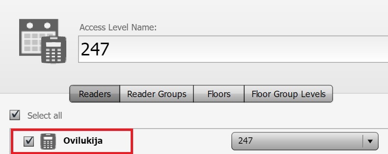 - Kun tiedät, minkä Access Level -ryhmien kulkuoikeudet haluat poistaa, valitse haluamasi ryhmä ja poista valinta oikean palstan ovilukijasta: