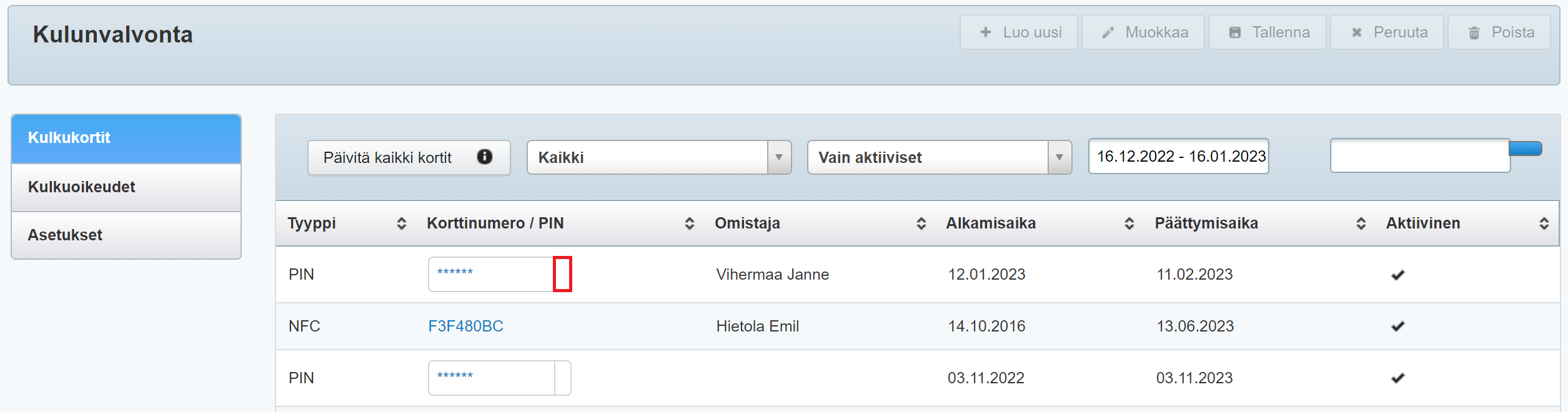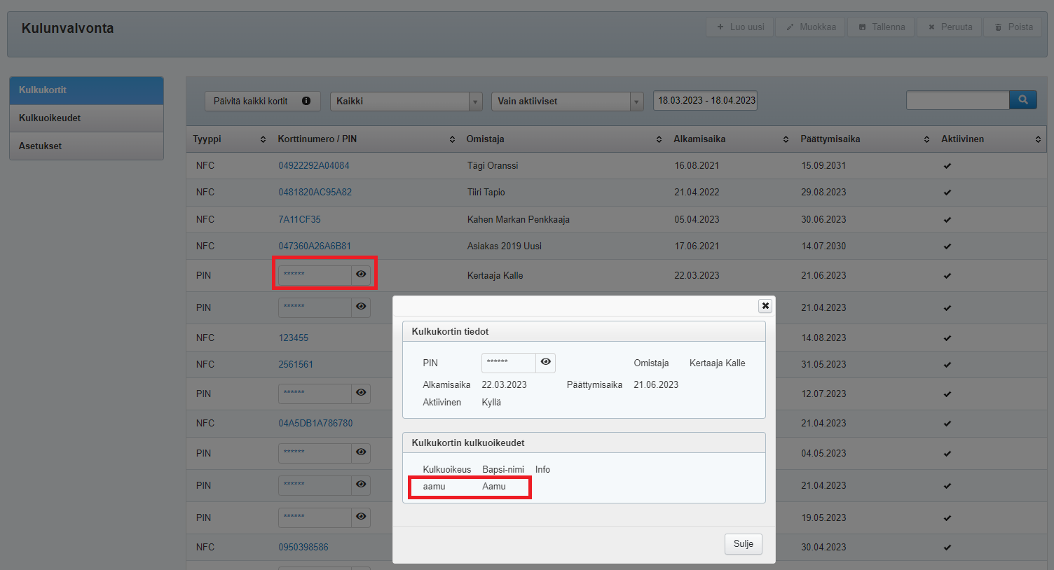 Asetusten Kulunvalvonta-osiosta löydät kaikkien voimassa olevien PIN-koodien ja kulkukorttien tiedot. PIN-koodi on listauksessa piilotettu, mutta jos käyttäjän oikeudet riittävät, PIN-koodin saa näkyviin laatikon oikeaa laittaa klikkaamalla: