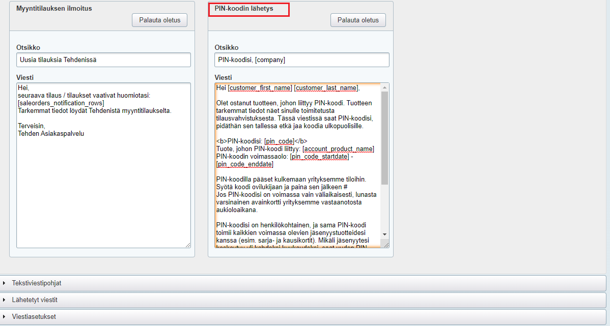 PIN-koodista lähetettävä viestipohja löytyy Tehdenin Yritysasetusten Viestien hallinta -osiosta nimellä PIN-koodin lähetys. Voit muokata viestin sisältöä ja lisätä siihen yrityksesi prosesseihin liittyviä lisätietoja. Jos poistat vahingossa PIN-koodin tai sen voimassaoloajan viestille tuovat koodinpätkät, voit aina palauttaa oletusviestin Palauta oletus -painikkeesta: