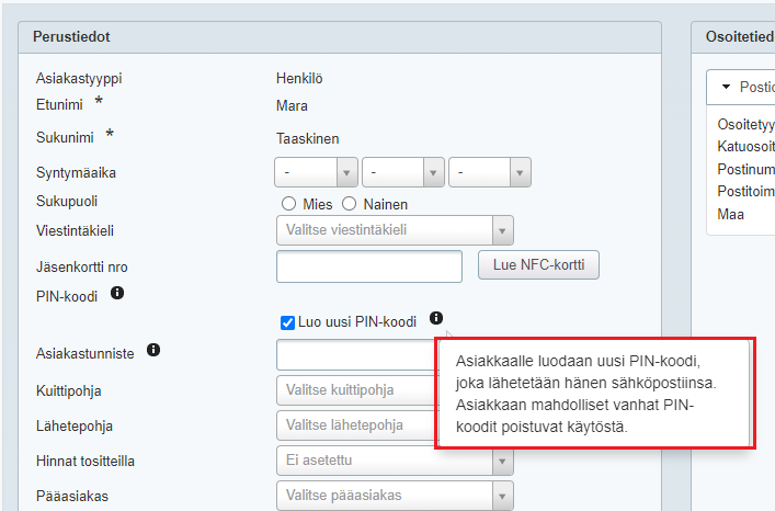 PIN-koodi asiakkaan tiedoissa