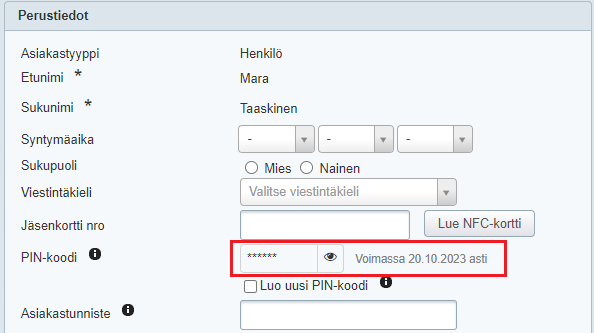 Asiakkaan henkilökohtainen PIN-koodi sekä sen voimassaoloaika löytyvät myös asiakkaan asiakaskortilta, perustiedoista. Oletuksena koodi on piilotettu, mutta jos oikeutesi riittävät siihen, saat koodin näkyviin silmäkuvaketta napsauttamalla: