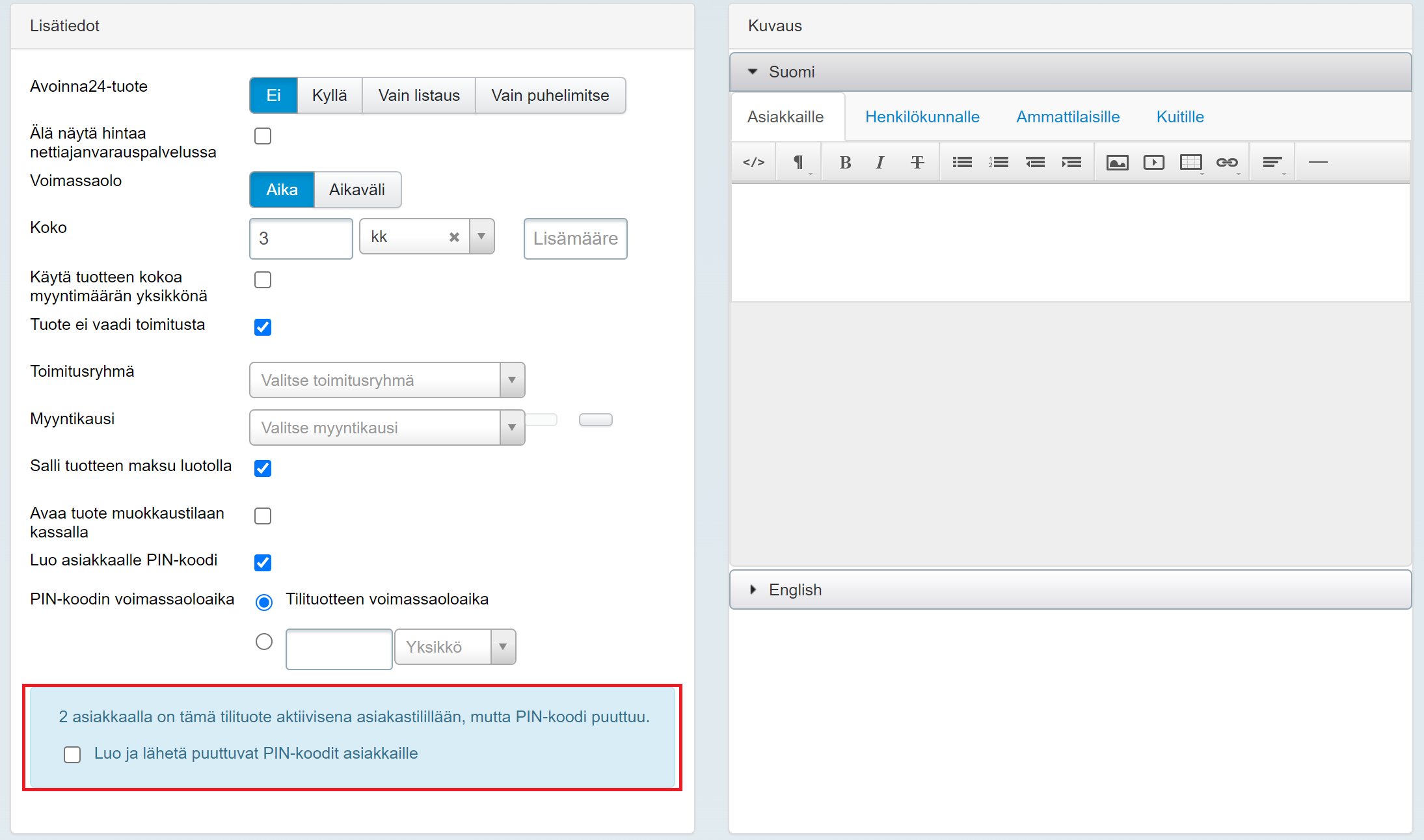 - Huom! Tuotteen Kuvaus asiakkaalle -kenttään voi halutessaan lisätä tietoa PIN-koodin toiminnasta, esimerkiksi maininnan siitä, että PIN-koodi pysyy samana, kunhan aktiivisten korttien välillä on alle 2 kuukauden tauko. Voit halutessasi kopioida tähän asiaa koskevan tekstinkatkelman Tehdenin PIN-kooodin lähetys -viestipohjasta (katso kohta PIN-koodinsta lähetettävä sähköposti
