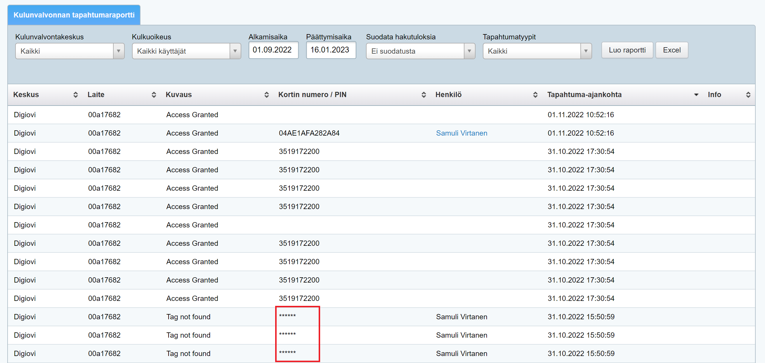 Kulunvalvonnan tapahtumaraportista näet, onko ovista kuljettu NCF-tagilla vai PIN-kortilla. Kun Kortin numero / PIN -sarakkeessa näkyy asteriskeja, kulku ovista on tapahtunut PIN-koodilla: