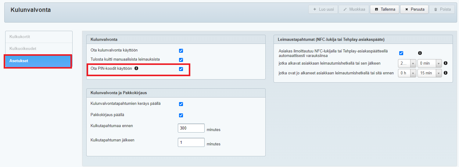 Jos yrityksessäsi on ollut käytössä NFC-tagit, PIN-koodi toimii kulunvalvonnassa aivan kuten tagitkin, eli esim. pakkokirjaus tapahtuu vastaavasti. HUOM! Jos asiakkaasi leimaavat itsensä tunneille asiakaspäättellä, se onnistuu jatkossakin vain NFC-tagilla.