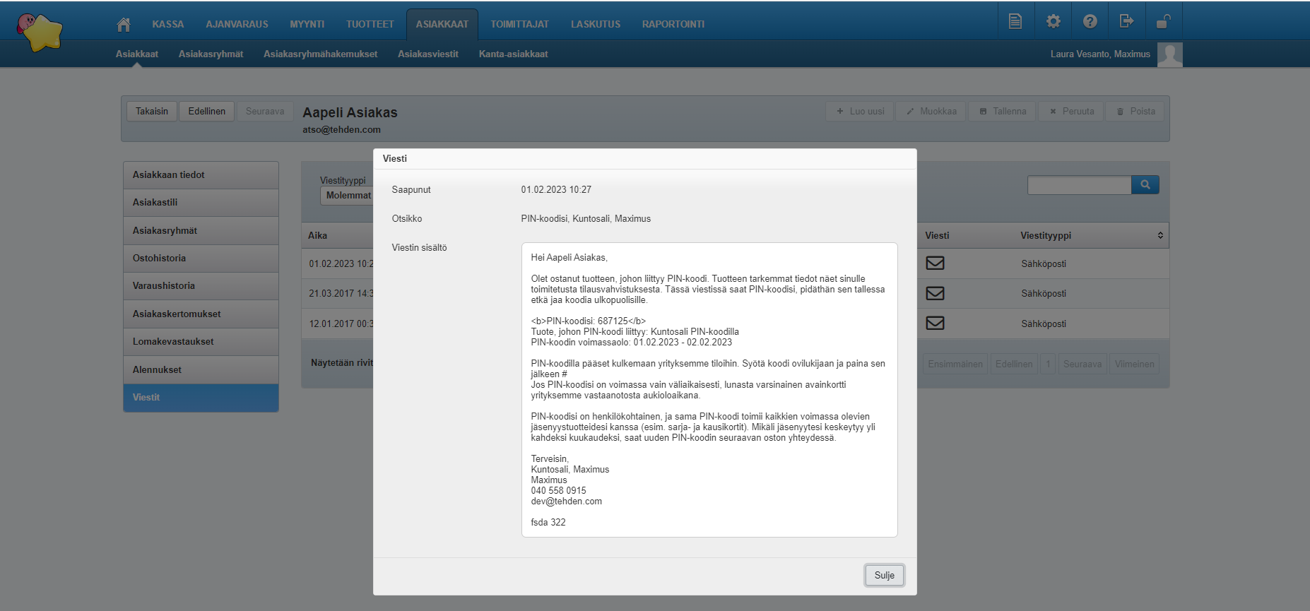 Jos syntyy epäselvyyttä siitä, onko PIN-koodin sisältävä viesti toimitettu asiakkaalle, voit tarkastaa tämän Tehdenistä, Yritysasetusten Viestien hallinnasta. Lähetetyt viestit -osiosta löytyvät kaikki viestit, joita Tehdenistä on lähetetty asiakkaille. Viestit löytyvät myös asiakkaan tiedoista, Viestit-välilehdeltä: