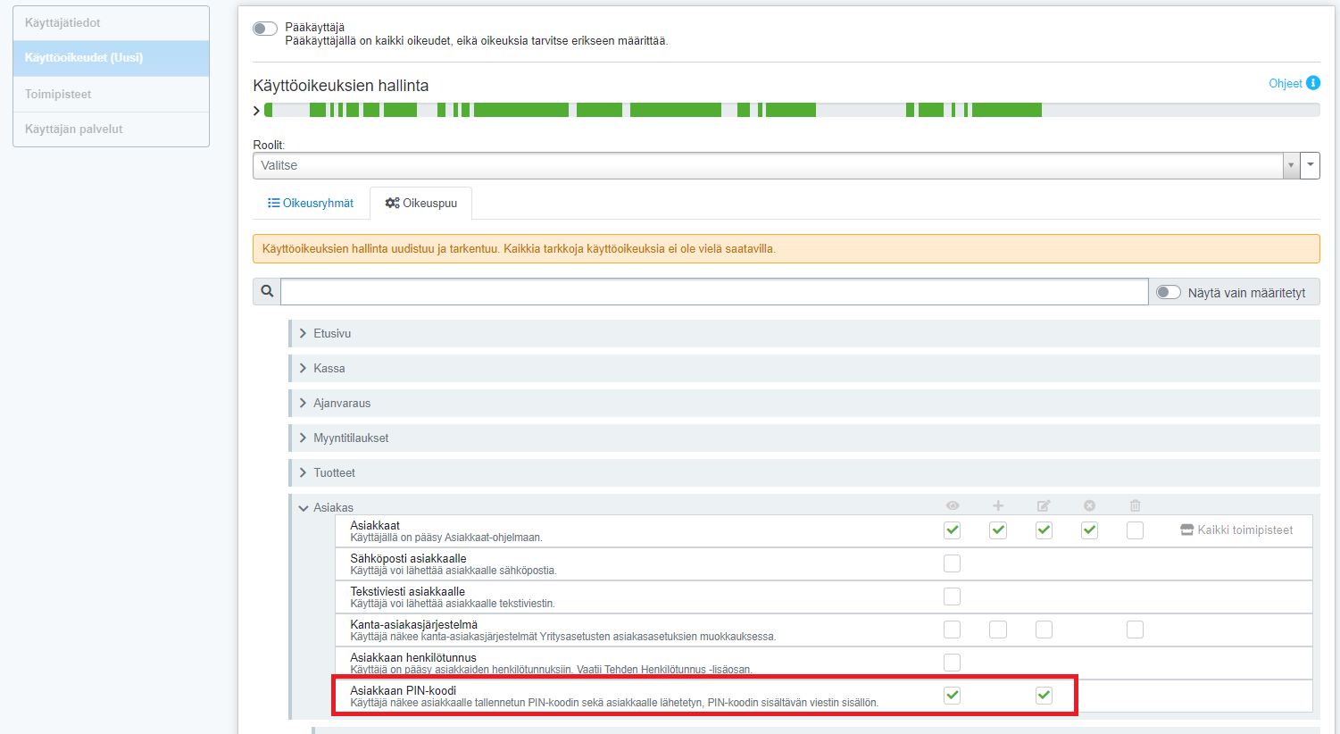 Jos PIN-koodioikeudet halutaan antaa myös tähän ryhmään kuulumattomille käyttäjille tai tai supistaa palvelutyöntekijän oikeuksia, voi muutokset tehdä Oikeuspuu-välilehdellä, Asiakkaat-osiossa: