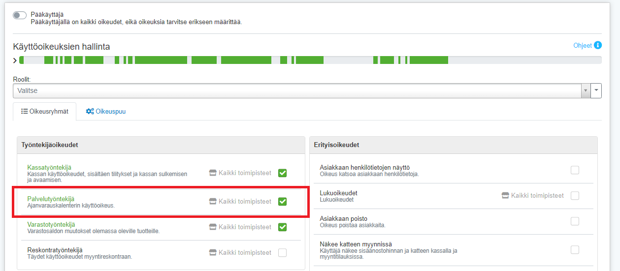 Käyttäjällä on PIN-koodin luku- ja muokkausoikeus, jos tälle on Oikeusryhmät-välilehdellä annettu Palvelutyöntekijä-käyttäjäoikeus: