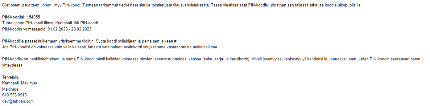 Jos PIN-koodi on otettu käyttöön tuotteella, jota myydään Avoinna24:n kautta (verkkokaupassa ja/tai Liity jäseneksi -ominaisuuden kautta), asiakas saa koodin sähköpostitse heti kun verkkomaksu on käsitelty. Viesti lähetetään asiakkaan oletussähköpostiosoitteeseen. Seuraava viesti on Tehdenin oletusviestipohjan mukainen: Seuraava viesti on Tehdenin oletusviestipohjan mukainen: