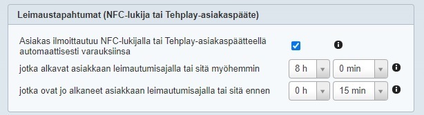 - Määritä leimaustapahtuman asetukset suhteessa varauksen alkamisaikaan: esim. jos asiakas on ilmoittautunut kahteen peräkkäiseen ryhmäliikuntatuntiin, merkitäänkö hänet samalla leimauksella saapuneeksi molempiin.