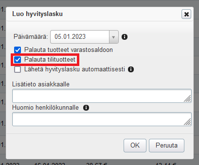 - Palauta tuotteet varastosaldoon -kohta on oletuksena valittu, vaikka laskulla ei olisi myyty varastotuotteita. Tämä valinta ei siis vaikuta tilituotteeseen tai asiakkaan jäsenyyteen.
