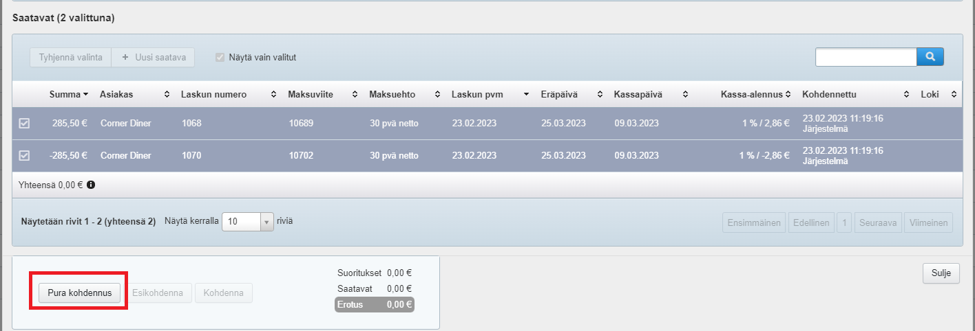 - Nyt voit taas siirtyä Saatavat-sivulle ja kohdentaa juuri tekemäsi laskun ja hyvityslaskun toisiinsa.