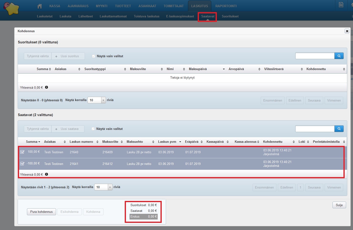 - Valitse sivun alaosasta Kohdenna. Varmista ennen kohdennusta, että Suoritukset- ja Saatavat -summat täsmäävät ja alaosan kohdassa Erotus on vihreällä pohjalla loppusumma nolla (0,00 €).