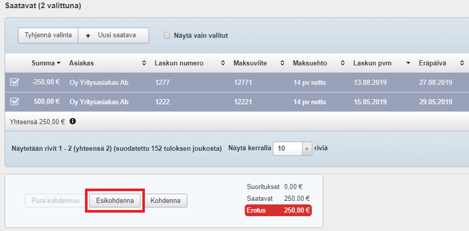 - Jos alkuperäisestä laskusta osa jää asiakkaan maksettavaksi, näkyy Saatavat-ikkunassa valittuna alkuperäinen lasku ja hyvityslasku ja erotuksena laskulle maksettavaksi jäävä summa. Valitse silloin kohdennus-ikkunan alaosasta Esikohdenna. Lasku kuittaantuu kokonaan kohdennetuksi kun asiakkaan maksama osasuoritus kohdentuu maksamattomalle osuudelle.