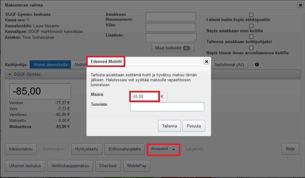 Huom! Jos haluat hyvittää maksun, josta on maksettu ennakkomaksua (esim. osa laskusta käteisellä tai liikuntaedulla kassaan), ja palauttaa rahat ennakkomaksun maksutavalle, palautus täytyy tehdä kuitin kautta.