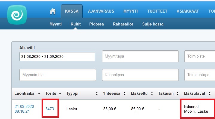 - Etsi maksutapahtuman kuitti Kassa-ohjelman Kuitit-osiosta: