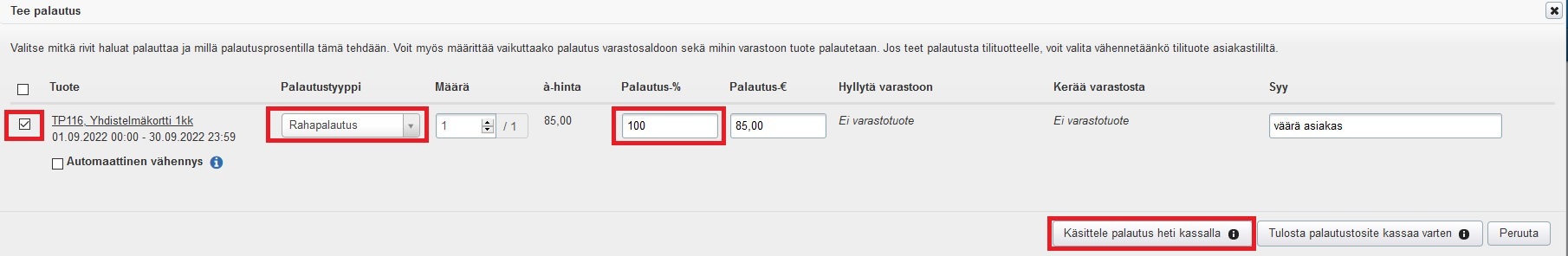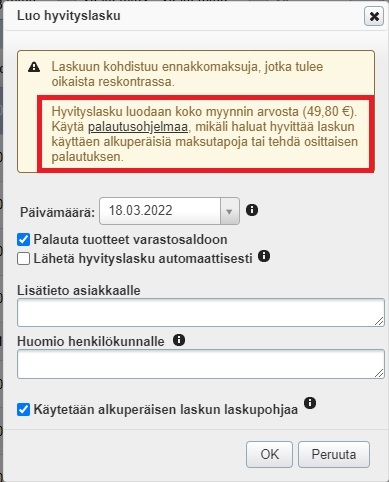 - Valitse palautetaanko laskun varastotuotteet varastosaldoon tai tilituotteet asiakastilille.