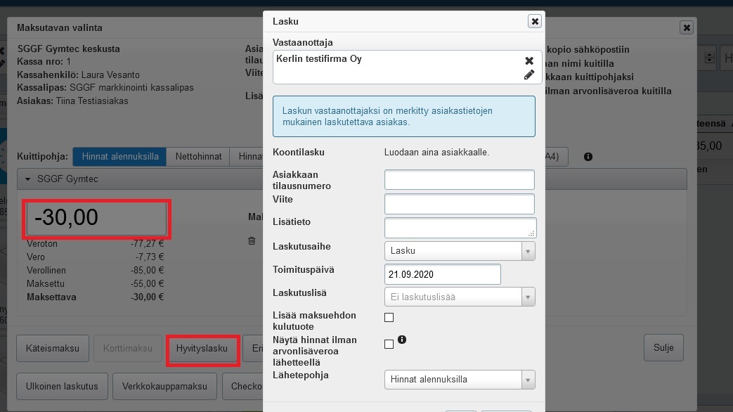 - Klikkaa Tallenna. Jos osa alkuperäisestä kuitista oli maksettu lasku-maksutavalla ja haluat palauttaa myös sen summan asiakkaalle, klikkaa Hyvityslasku-painiketta ja luo asiakkaalle hyvityslasku haluamillasi tiedoilla: