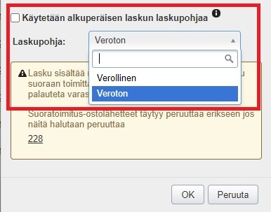 - Jos olet ottanut käyttöön uuden laskupohjan, voit valita käytetäänkö hyvityslaskulla samaa laskupohjaa kuin alkuperäisessä laskussa vai valitaanko hyvityslaskulle jokin muu yrityksen laskupohjista. Jos olet muokannut laskupohjia alkuperäisen laskun lähettämisen jälkeen, hyvityslaskulla voidaan siis edelleen käyttää alkuperäisen laskun pohjaa, vaikka sitä ei enää muuten olisikaan käytössä.