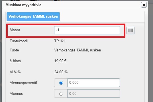 - Luo kassalla miinusmerkkinen myynti hyvitettävistä tuotteista/palveluista, eli lisää tuote kassalle, klikkaa se muokkaustilaan ja muuta myyntimäärä miinusmerkkiseksi: