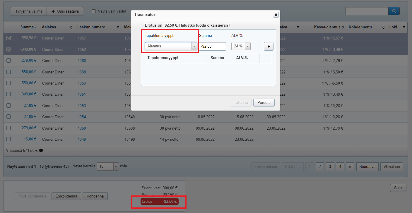 - Jos summa ei täsmää, pääset Kohdenna-painikkeen klikkaamisen jälkeen kirjaamaan erotuksen oikaisueränä jollekin myyntireskontran tapahtumalajille (esim. alennus):
