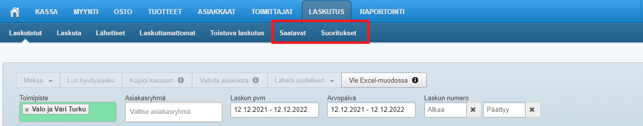 - Voit suodattaa taulukkoa toimipisteen, laskunpäivämäärän tai laskun tilan mukaan.