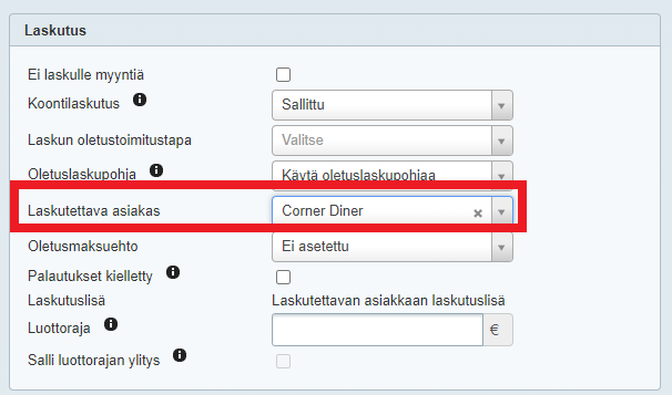 Jos esim. alaikäisen asiakkaan laskut maksaa aina toinen asiakas (huoltaja), voit merkitä alaikäisen asiakkaan tietoihin kuka hänen laskunsa maksaa. Tällöin ohjelma vaihtaa automaattisesti laskun vastaanottajaa kassalla ja myyntitilauksella aina, kun alaikäiselle asiakkaalle muodostetaan lasku. Laskutettava asiakas määritellään asiakkaan tiedoissa, Laskutus-osiossa: