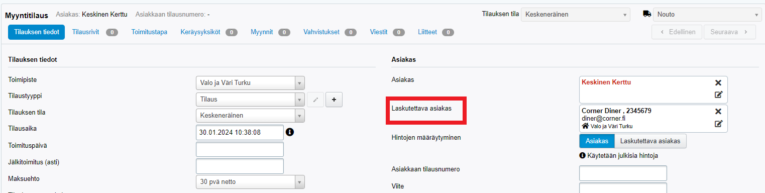 Myyntitilauksella laskutettavalle asiakkaalle on oma kenttänsä. Jos asiakkaalle on merkitty laskutettava asiakas, Tehden lisää sen myyntitilaukselle automaattisesti, kun Asiakas-kenttään haetaan asiakas: