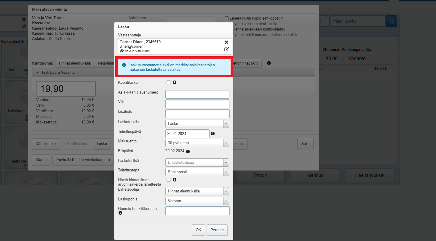 Jos asiakkaalle on asetettu laskutettava asiakas, Tehden vaihtaa laskun vastaanottajan automaattisesti kassalla ja ilmoittaa siitä: