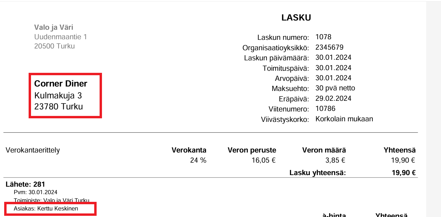 Laskulla laskutettava asiakas näkyy laskun vastaanottajana ja asiakas laskun rivitiedoissa (yrityksen laskupohjan mukaisesti):