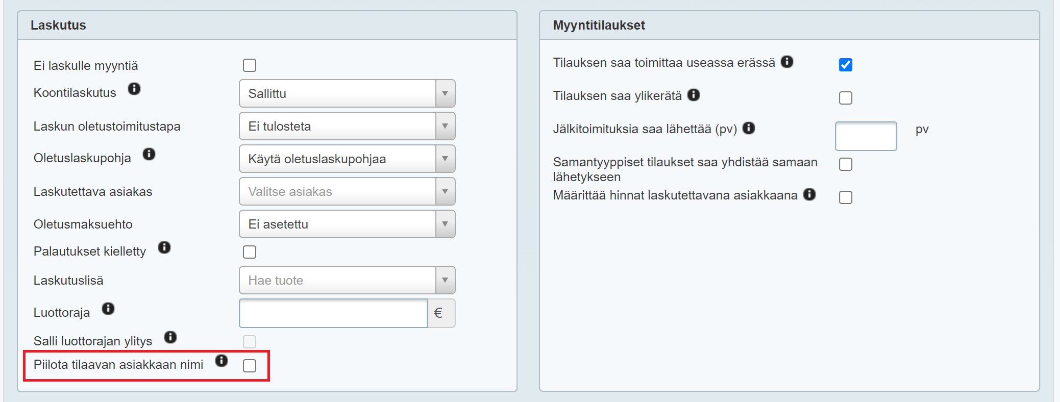 Joskus laskutettava asiakas (esim. kunta, hyvinvointialue, vakuutusyhtiö tms.) vaatii, että varsinaisen asiakkaan tietoja ei saa näyttää laskulla. Tällaisessa tapauksessa voit käydä laskutettavan asiakkaan asiakaskortilla Laskutus-osiossa valitsemassa kohdan Piilota tilaavan asiakkaan nimi: