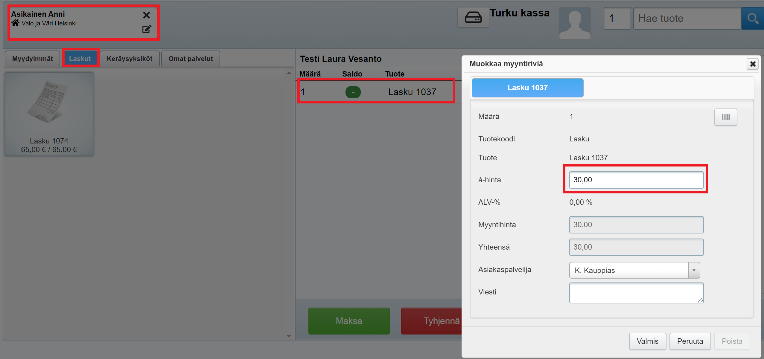 Laskun maksettavaa loppusummaa voidaan muokata kassalla, kun lasku on lisätty työkuitille. Muokkaus tapahtuu klikkaamalla kassanäkymän työkuitilla olevaa laskuriviä ja muokkaamalla avautuvassa ikkunassa kohtaa a-hinta siten, että tähän kirjataan osittain maksettava summa: